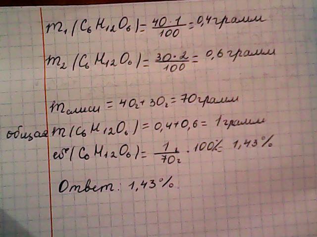 К 40 г 1%-ного раствора глюкозы добавили 30 г 2%-ного раствора ее. Какой стала массовая доля углевода в растворе после смешивания?