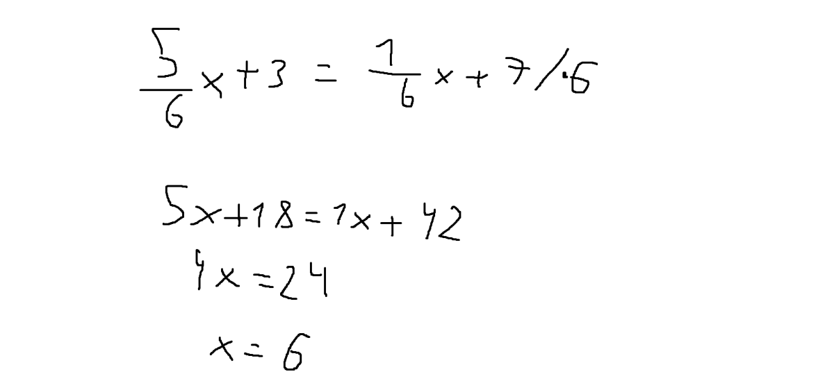 Приводим к общему множителю чтобы избавиться от дроби и сделать обычное линейное уравнение, как видим везде один множитель 6, у тройки и семерки один. Умножаем попутно сокращая, например 6(5x)/6 как мы видим можно просто сократить 6 и оставить просто 5x, дальше 6*3 здесь ничего сокращать нельзя, так и оставляем