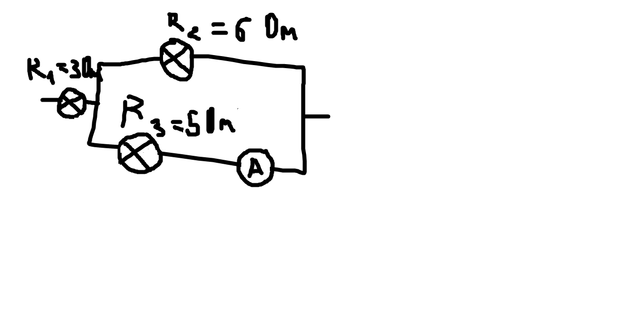 Определите мощность 1ой лампы если амперметр показывает 2А. Сопротивление 1ой лампы равно 3 Ом, R2= 6 Ом, R3= 5 Ом.
