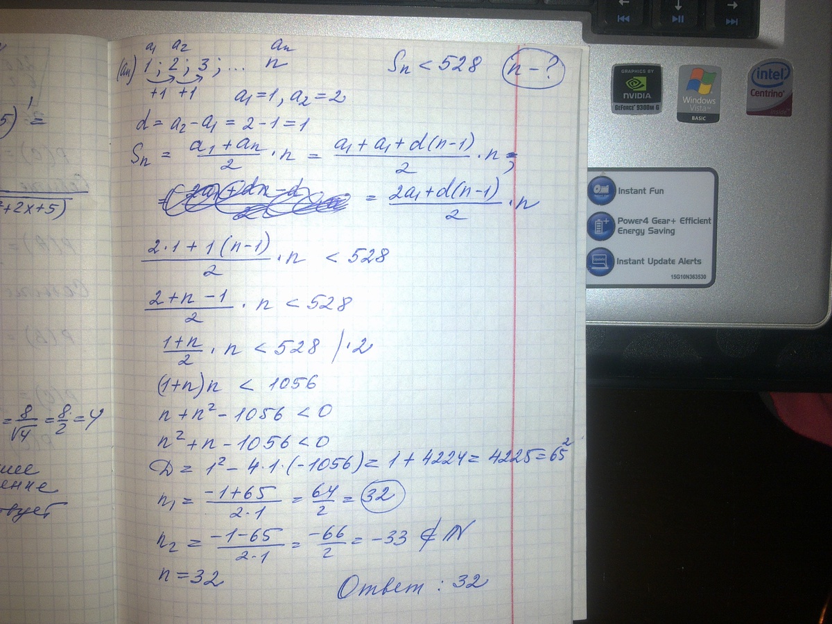 Какое наибольшее число последовательных натуральных чисел, начиная с 1, можно сложить, чтобы получившаяся сумма была меньше 528? подробно