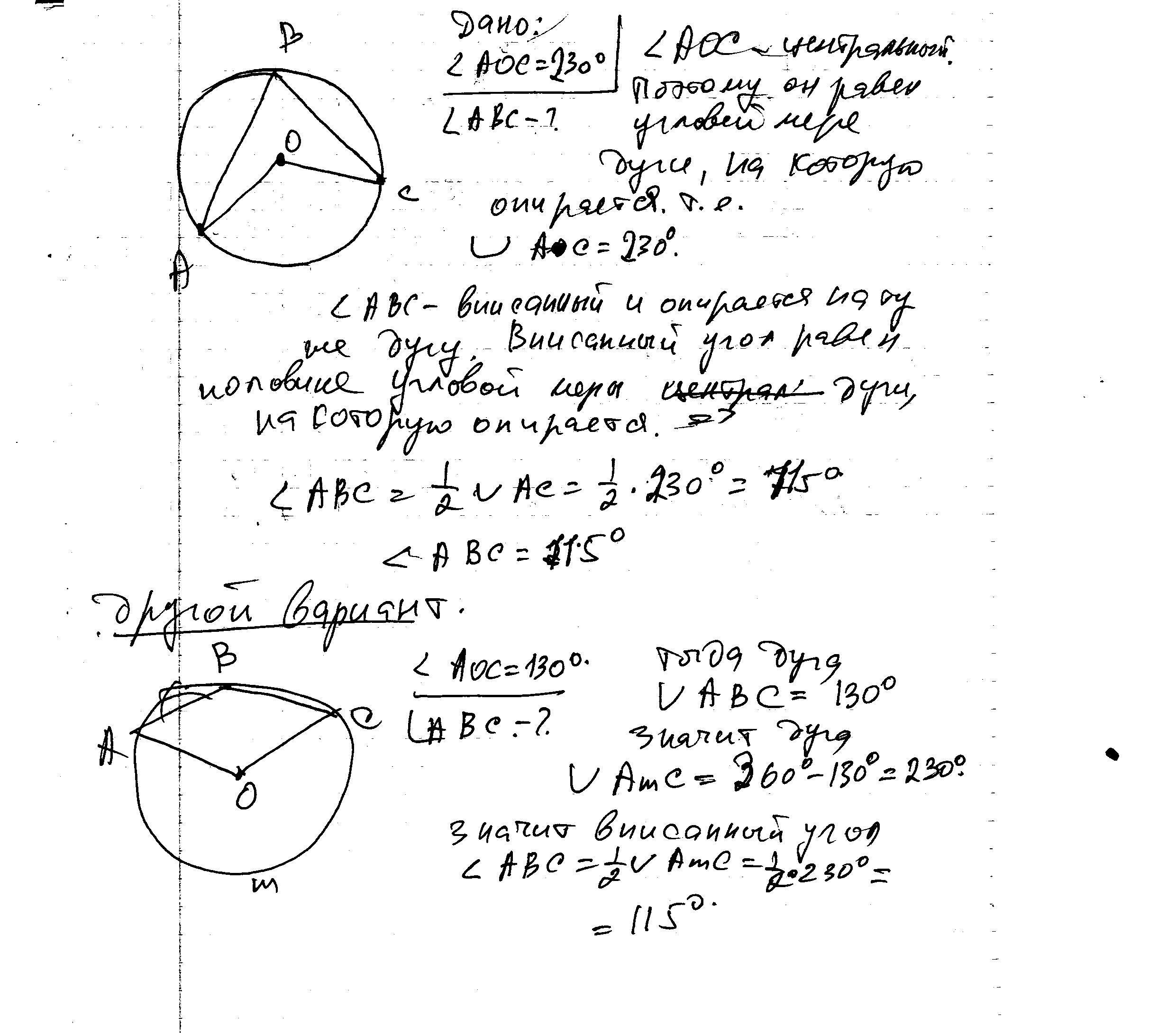 Найдите градусную меру угла ABC , если O - центр окружности и угол AOC равен 130 градусам, ответ должен быть 115, объясните пожалуйста.