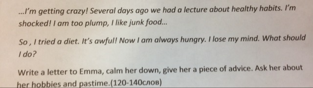Я получаю с ума! severaldoys ого у нас была лекция obout вересковый привычек. гт в шоке! я слишком пухлые, Аке нездоровой пищи. так, пытался ewfier диета г 'ы Теперь ом всегда голодны сойду с ума. Whot должны делать? написать письмо Эмме, успокоить ее, дать ей совет. Спросите ее о хобби и времяпрепровождение. (120-140cnos)