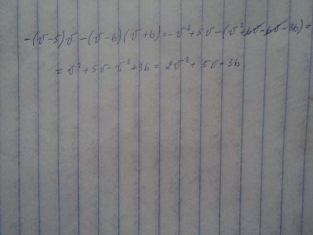 -v(v-5)-(v-6)(v+6)=-v во второй + 5v - (v во второй - 36) = -v во второй + 5v - v во второй + 36