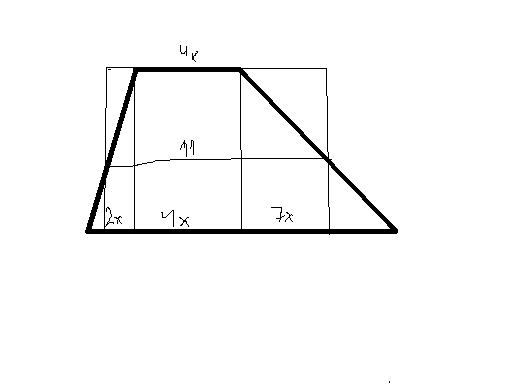 6. площадь трапеции равна произведению ее сред линии на высоту h,но также произведению среднего арифметического оснований на эту же высоту.Высоту сокращаем и приравниваем 11=((2х+4х+7х это низ) +4х (это верх))/2 .....х=11/17, 4х(верх)=44/17 (сократишь сам),низ =2х+4х+7х=13х=13*11/17= ...сам дорешаешь.