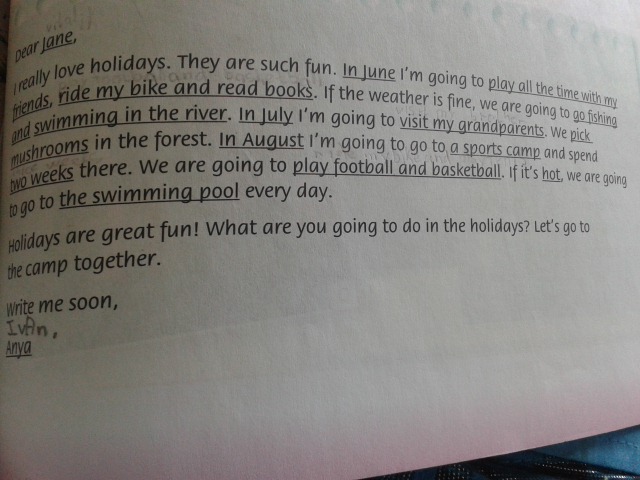 Мне очень нравятся каникулы, это очень весело. В июне я собираюсь проводить всё своё время с друзьями, кататься на велосипеде и читать книги. Если погода будет хорошей, мы пойдём ловить рыбу и купаться в реке. В июле я собираюсь навестить бабушку с дедушкой. Мы собираем грибы в лесу. В августе я собираюсь поехать в спортивный лагерь на две недели. Мы будем играть в футбол и баскетбол. Если будет жарко, мы каждый день будем ходить плавать в бассейн.