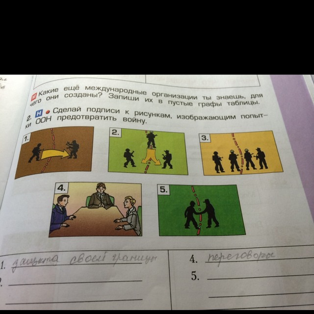 Сделай подписи к рисункам, изображающим попытки ООН предотвратить войну. Проверьте правильно сделала некоторые.