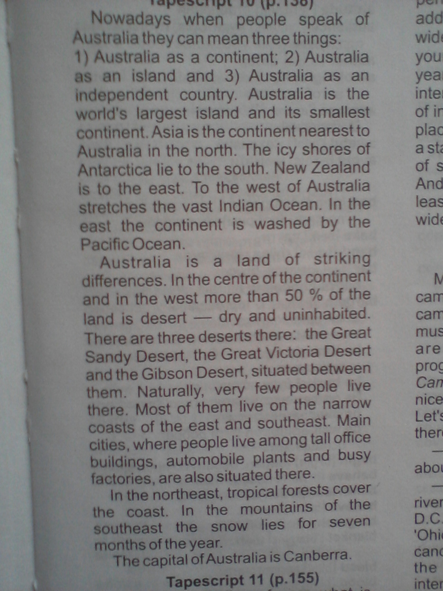 Australia is a land of striking differences. In the centre of the continent and in the west more than 50 % of the land is desert — dry and uninhabited. There are three deserts there: the Great Sandy Desert, the Great Victoria Desert and the Gibson Desert, situated between them. Naturally, very few people live there.