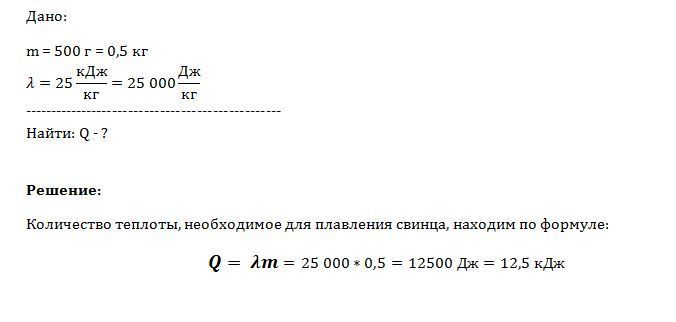 Какое количество теплоты потребуется для плавления куска свинца массой 500г,взятого при температуре плавления?Удельная теплота плавления свинца 25кДж/кг.
