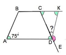 Угол А равнобедренной трапеции ABCD равен 75 градусов. Из точки D проведена прямая, которая пересекает прямую ВС в точке К, и СD=DK. Найдите угол CDK. Ответ дайте в градусах