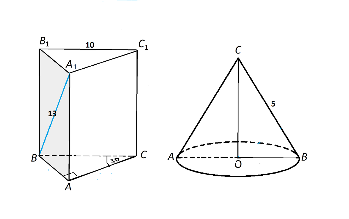 №1)Основание прямой призмы -прямоугольный треугольник с гипотенузой 10 см и острым углом 30 градусов . Диагональ боковой грани ,содержащей катет ,противолежащий данному углу ,равна 13 см . Найдите объём призмы.