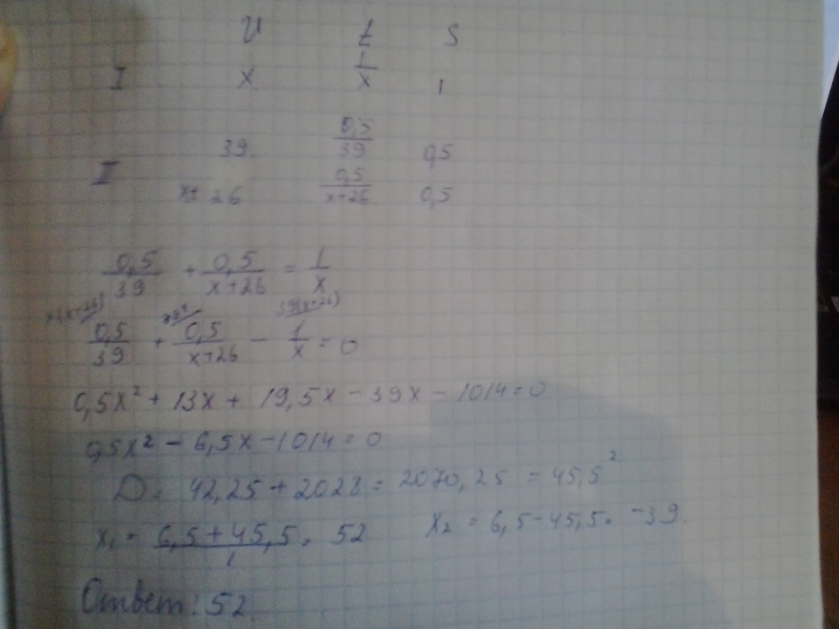 уравнение получается 0,5/39+0,5/X+26=1/x . А в ответе получается 52