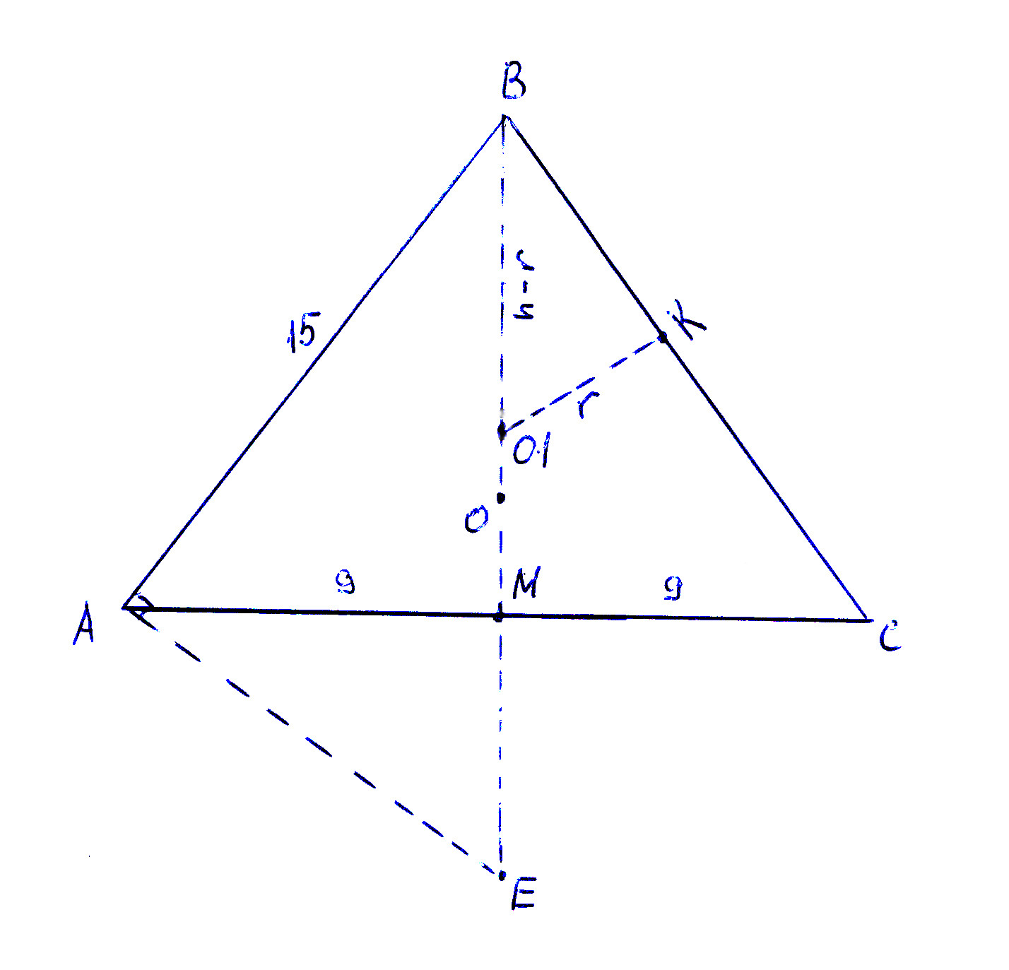 Основание АС равнобедренного треугольника АВС равно 18 см, а боковые стороны АВ и ВС равны 15 см. найдите радиусы вписанной и описанной около треугольника окружности. Помогите решить задачу только без этого : R = а·b·b/(4S) r = S/p