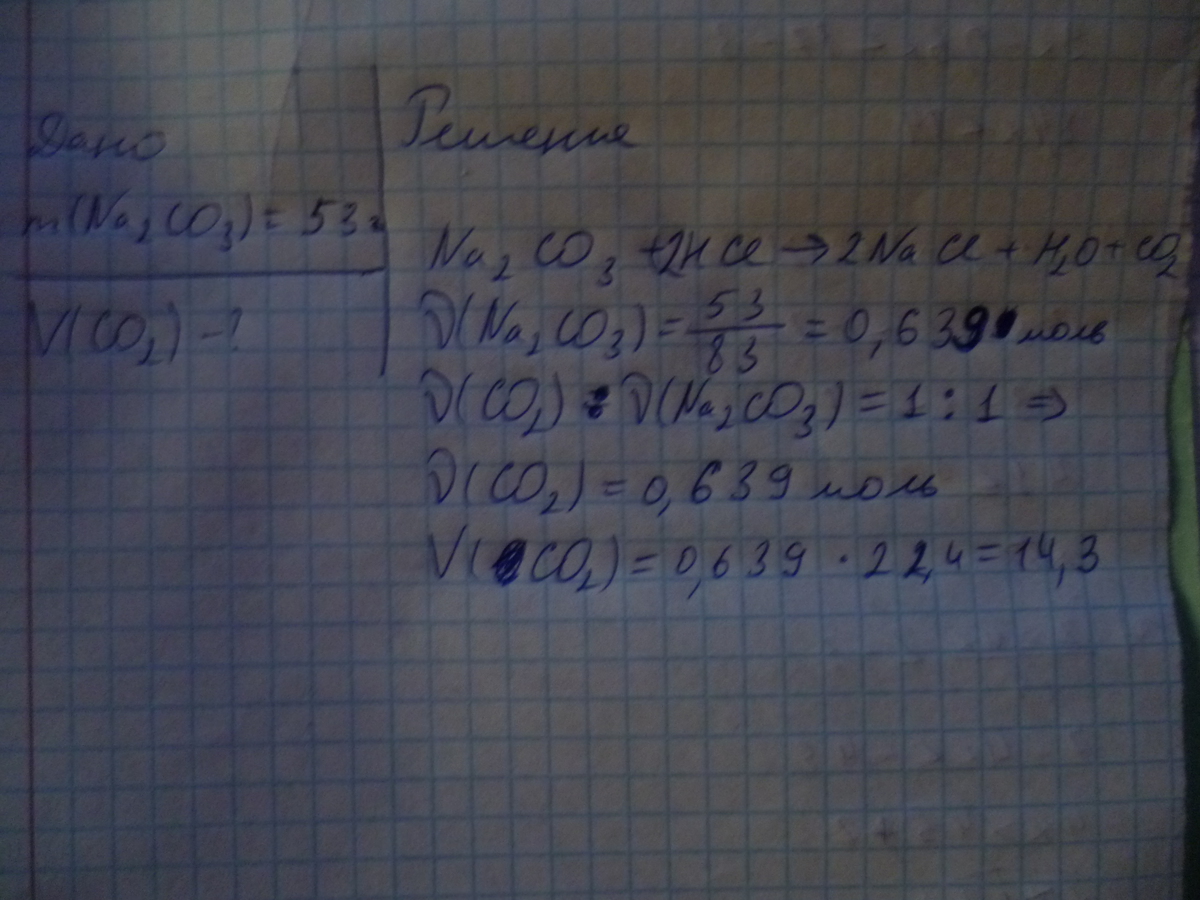 рассчитайте объем газа, который выделился при взаимодействии 53 г карбоната натрия с соляной кислотой
