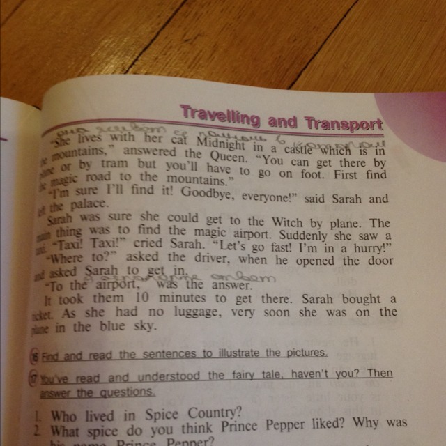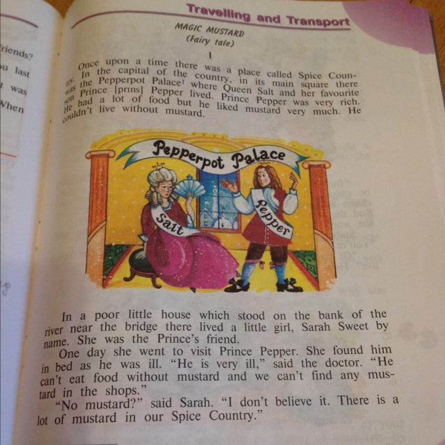 Когда-то давно было место,которое называлось Страна Специй. В столице страны ,на ее главной площади был Перцовый дворец где жили королева Соль и ее любимый сын- принц Перец. Принц Перец был очень богат. У него было много еду,но очень любил горчицу. Он не мог жить без горчицы. В бедном,маленьком доме,который находился на берегу реки рядом с мостом,в нем жила маленькая девочка которую звали Сара Свит. Она была подруга принца. В один день она пришла навестить принца. Она обнаружила его в кровати,он был болен. "Он очень болен"- сказал доктор. Он не может есть еду без горчицы и мы не может найти горчицу ни в одном магазине. "Нет горчицы"? спросила Сара. " Я не верю в это. В стране Специй много горчицы". "Но это не тот вид", сказала Королева. "Это должна быть волшебная горчица. Кто то украл у Принца все семена волшебной горчицы. Мы обратились в полицию,но они не могут найти семена. Мы думает Уксусная ведьма сделала это,но она ни с кем не разговаривает кроме милых,молодых девочек". Вдруг доктор посмотрел на Сару "Почему", он сказал. "Ты милая,молодая девочка. Ты поможешь нам?" "Конечно я помогу!" ответила Сара. "Но где ведьма живет? Как я могу попасть туда?" "Она живет со своей кошкой Полночь в замке который в горах". ответила королева. "Ты можешь туда попасть на самолеты или на трамвае,но тебе придется пройтись пешком. Для начала найди волшебную дорогу в горы". "Я уверена я найду! До свидания все!" сказала Сара и покинула дворец. Сара была уверена что она доберется до ведьмы на самолете Главная цель-это найти волшебный аэропорт. Вдруг она увидела (там плохо видно) "Такси такси!" закричала Сара. "Поехали быстрее!Я тороплюсь!" "Куда?" спросил водитель, когда он открыл дверь и предложил Саре сесть в машину. "В аэропорт" таковым был ответ. потребовалось всего 10 минут чтоб доехать до туда. Сара купила билет. Так как у нее не было багажа,она очень скоро оказалась в самолете в голубом небе.