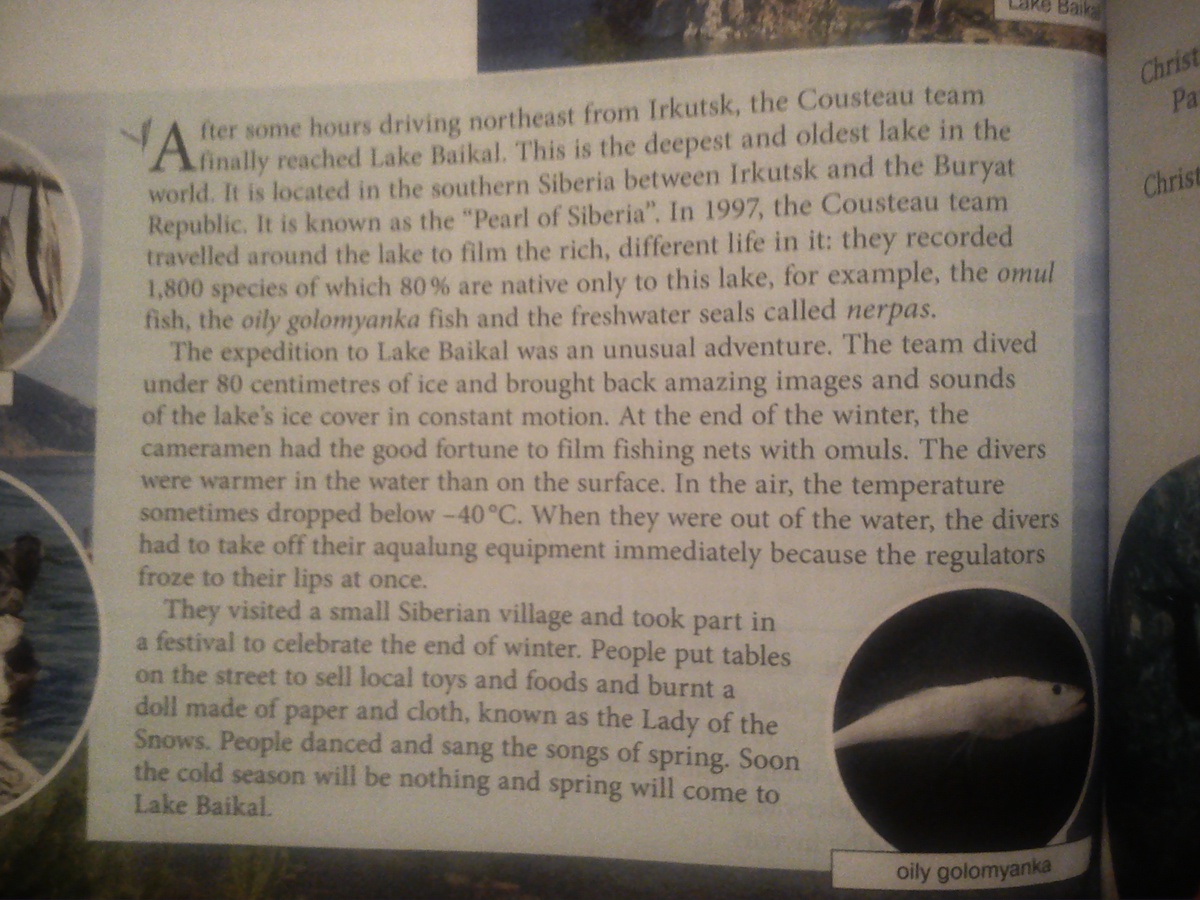 После нескольких часов езды на северо-восток от Иркутска, команда Кусто наконец добралась до озера Байкал. Это самое глубокое и древнее озеро в мире. Оно расположено на юге Сибири между Иркутском и Бурятской республикой. Оно известно как "жемчужина Сибири". В 1997 году, команда Кусто путешествовала вокруг озера для того, чтобы снять богатую, разнообразную жизнь в нем: они запечатлели 1800 видов, 80% которых обитают только в этом озере, например, рыба омуль, голомянка и пресноводные тюлени, называемые нерпами.