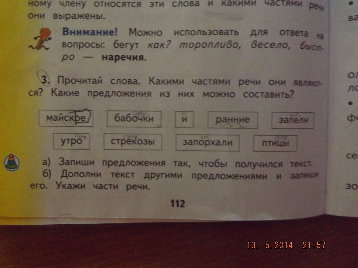 Майское-прилагательное, бабочки-существительное, и-союз, ранние-прилагательное, запели-глагол, утро-существительное, стрекозы-существительное, за порхали-глагол, птицы-существительное. Предложение: 1) Ранним майским утром запели птицы, запорхали стрекозы и бабочки.