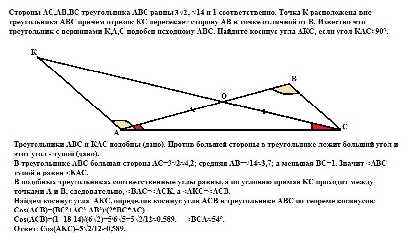 Стороны АС, АВ, ВС треугольника АВС равны 3 корня из 2, корень из 14 и 1 соответственно. Точка К расположена вне треугольника АВС, причём отрезок КС пересекает сторону АВ в точке, отличной от В. Известно, что треугольник с вершинами К, А и С подобен исходному. Найдите косинус угла АКС, если угол КАС>90 градусов.
