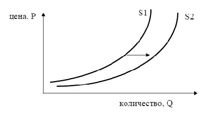 На графике изображено изменение предложения роликовых коньков на потребительском рынке. Что из приведённого ниже могло вызвать сдвиг кривой предложения из положения S1 в положение S2? (На графике по вертикали – цена товара, по горизонтали – количество товара.)