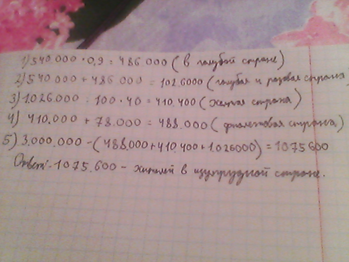 в розовой стране 540 000 жителей что составляет девять десятых жителей голубой страны желтой стране 40 процентов от общего числа жителей розовый и голубой страны а в фиолетовой стране на 78 000 жителей больше тема в желтой стране сколько жителей в изумрудном в городе если всего в волшебной стране насчитывается 3 000 000 жителей?