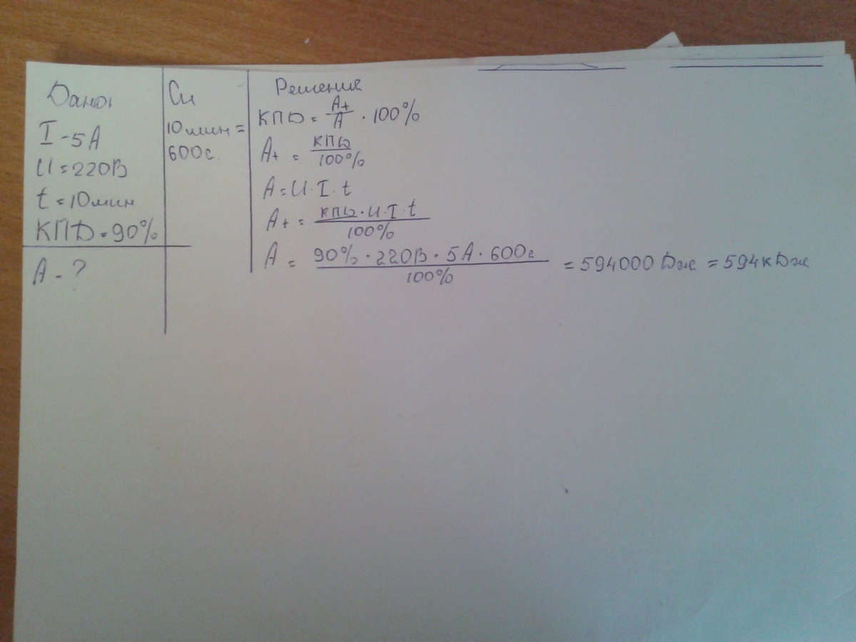 сила тока в двигателе кондиционера 5 А при напряжении в сети 220 В. Какую работу выполняет двигатель за 10 мин, если КПД равен 90%? напишите с дано, формулами(вычис.)