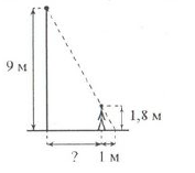На каком расстоянии (в метрах) от фонаря стоит человек ростом 1.8м, если длина его тени равна 1м, а высота фонаря 9м?