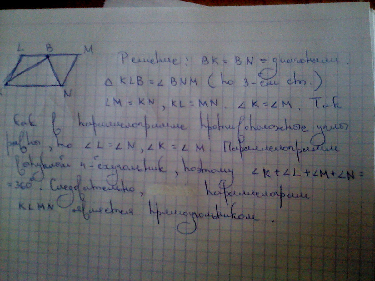 В параллелограмме KLMN точка В — середина стороны LM . Известно, что ВК = BN. Докажите, что данный параллелограмм — прямоугольник.