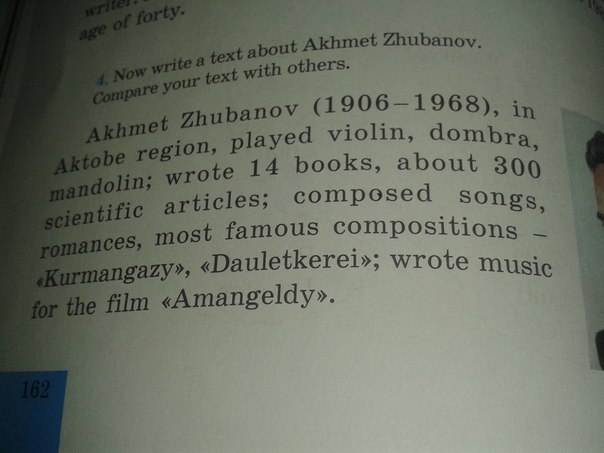 Ахмет Жубанов(1906- 1968), в регионе Актоб, играл на скрипке, домбре, мандолине; написал 14 книг, около 300 научных статей, сочинял песни, романсы, самые известные композиции- " Курмангази", "Даулетгерей"; написал музыку из фильма "Амангелди".