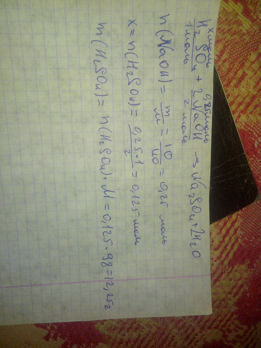 По уравнению реакции H2SO4 + 2NaOH→Na2SO4 + 2H2O рассчитайте массу серной кислоты, необходимой для полной нейтрализации раствора, содержащего 10г гидроксида натрия.