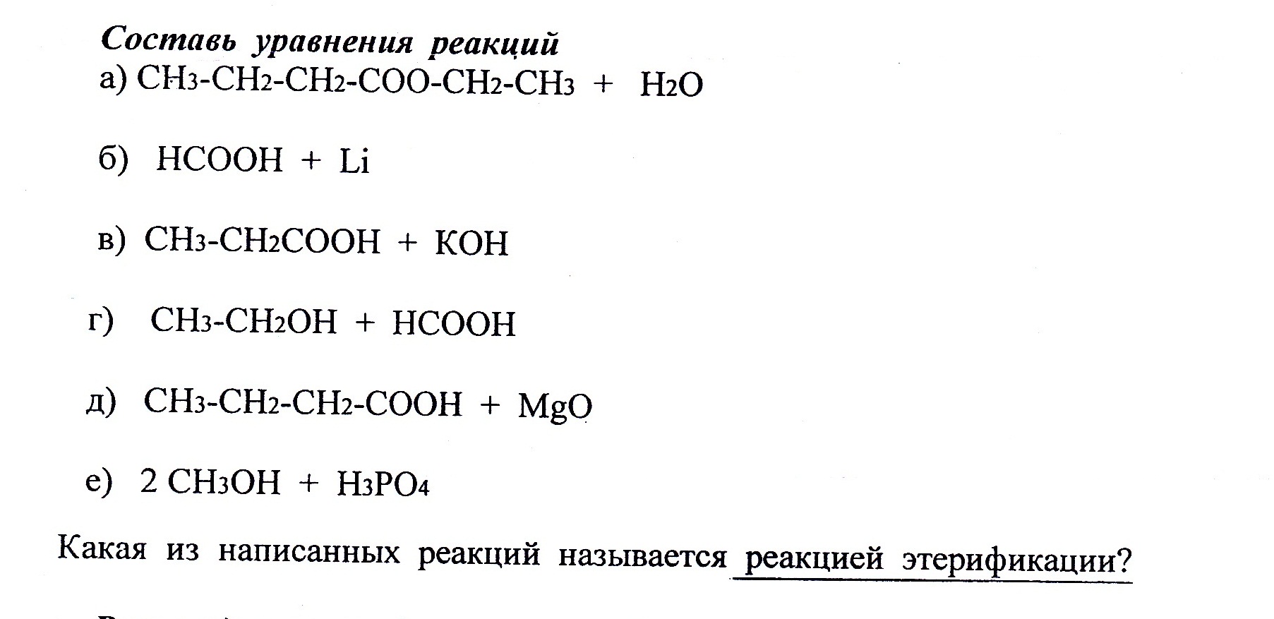 4)CH3-CH2-OH + HCOOH => HCOOCH2-CH3 + H2O (реакция этерификации)