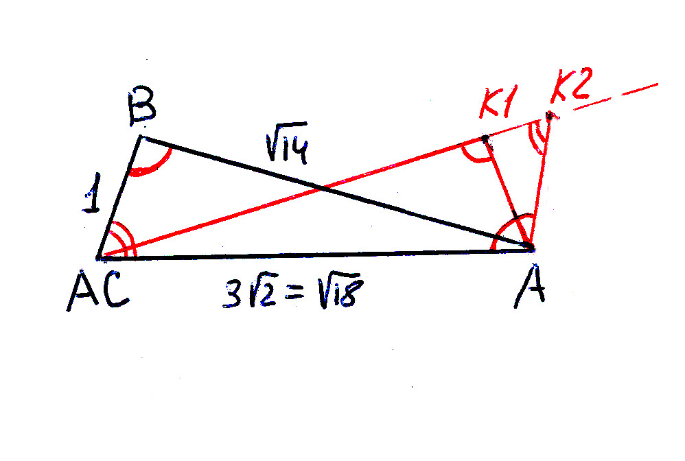 Стороны AC, AB, BC треугольника ABC равны 3√2, √14 и 1 соответственно. Точка К располагается вне треугольника ABC, прием отрезок KC пересекает сторону AB в точке, отличной от B. Известно, что треугольник с вершинами K, A и C подобен исходному. Найдите косинус угла AKC? если угол KAC > 90 градусов