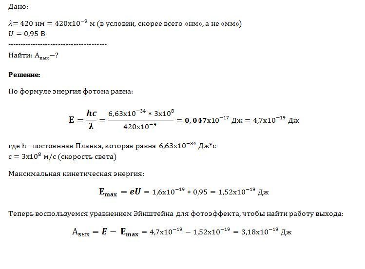 В опыте по фотоэффекту на пластину падает свет с длиной волны 420мм.Фототок прекращается при задерживающей разности потенциалов 0,95В. Определите работу выхода электронов с поверхности пластины