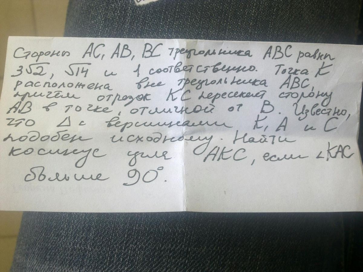 Я там слегка перемудрил. В обсуждении я исправился. Дело в том, что угол АКС тупой, и АКС подобен АВС. Поэтому надо вычислить единственный тупой угол в АВС. А он лежит против наибольшей стороны. А это 3*корень(2) - остальные меньше.