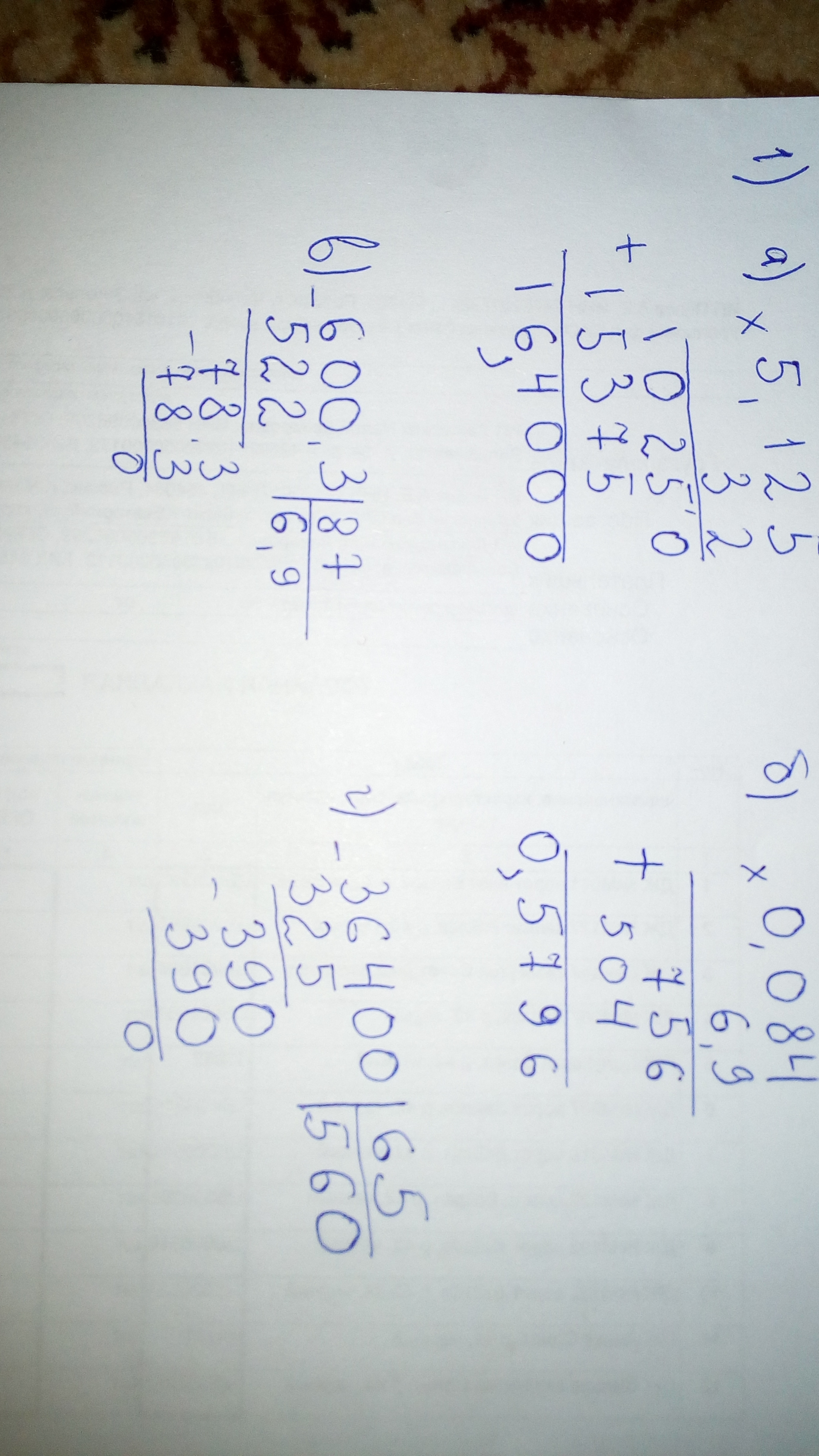 а). 3,2 ∙ 5,125; б). 0,084 ∙ 6,9;в). 60,03 : 8,7; г). 36,4 : 0,065