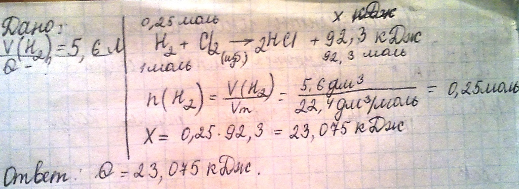 Определите кол -во теплоты (кДж), выделившееся в результате взаимнодействия 5, 6л, водорода с избытком хлора, согласно термохимическому уравнению H2+CI2->2HCI+92,3кДж