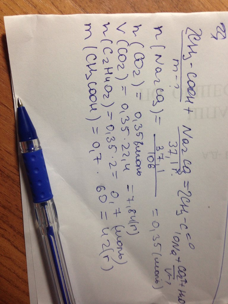 Обчисліть об'єм вуглекислого газу (н.у),що виділився при взаємодії оцтової кислоти з натрій карбонатом масою 37,1 г.Визначте масу витраченої оцтової кислоти.