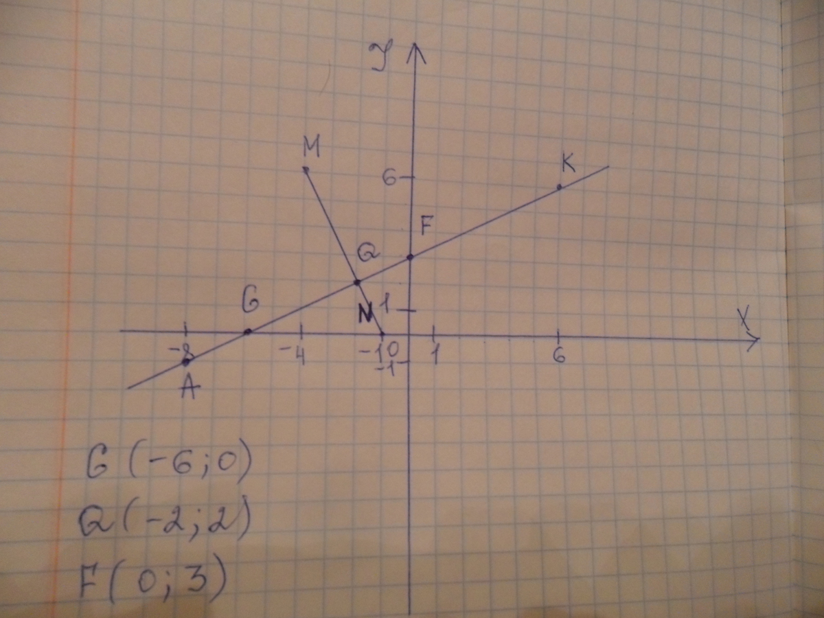 На координатной плоскости постройте отрезокMN и прямую АК, если М (–4; 6), N (–1; 0), А (–8; –1), К (6; 6). Запишите координаты точек пересечения прямой АК с построенным отрезком и осями координат.