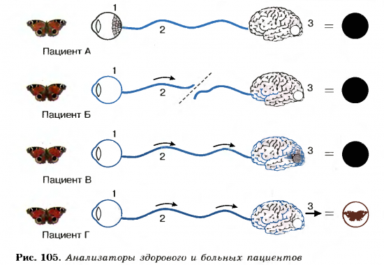 Пациент Б - имеет проблемы по ходу передачи нервного импульса от органа анализатора к головному мозгу.