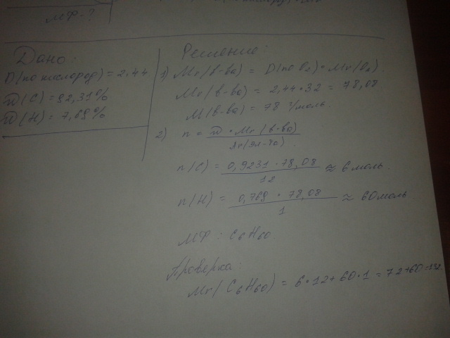Относительная плотность паров некоторого углеводорода по кислороду равна 2,44. массовые доли элементов в молекуле углеводорода составляют: углерода 92,31%, водорода 7,69%. Определите молекулярную формулу этого углеводорода.