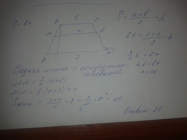 В трапеции ABCD основания AD и BC равны 7 и 1 соответственно, а её плошадь равна 64. Найдите площадь трапеции BCNM , где MN – средняя линия трапеции ABCD .