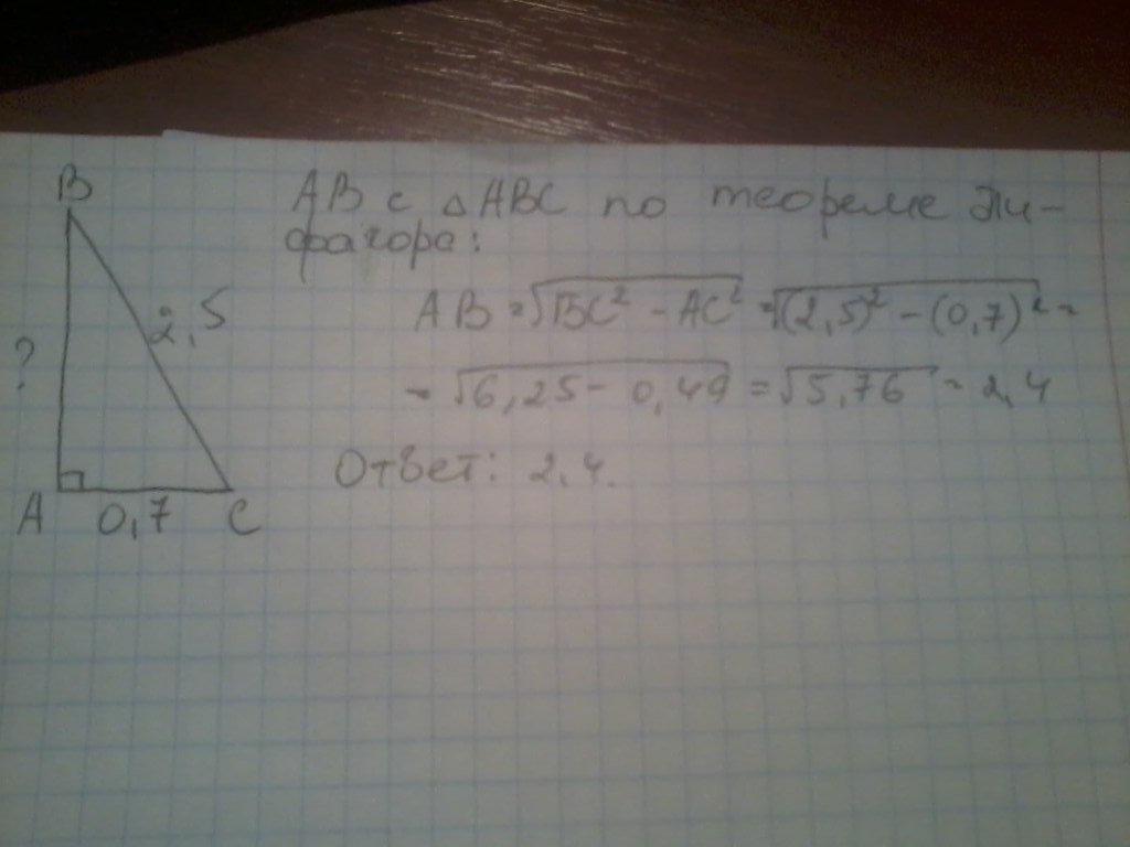лестницу длиной 2,5 прислонили к дереву.На какой высоте(в метрах) находится верхий ее конец,если нижний конец отстоит от ствола дерева на 0,7?