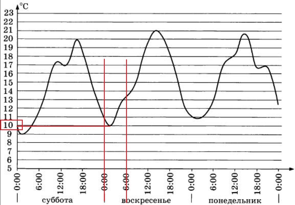На графике показано изменение температуры воздуха в некотором населенном пункте на протяжении трех суток, начиная с 0 часов субботы. На оси абсцисс отмечается время суток в часах, на оси ординат —значение температуры в градусах Цельсия. Определите по графику наименьшую температуру воздуха в ночь с субботы на воскресенье. Ответ дайте в градусах Цельсия.