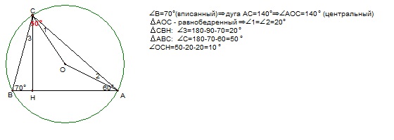 около треугольника ABC описана окружность с центром O. CH- его высота. Найти градусную меру угла OCH,если угол А равен 60 а угол B 70