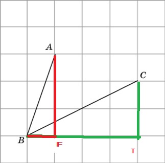 Найди разность углов ABF CBT, стороны треугольников -очевидны.Длины гипотенуз при желании можно вычислить из теоремы Пифагора (в прямоуг.треуг квадрат гипотен =сумме кв. катетов.