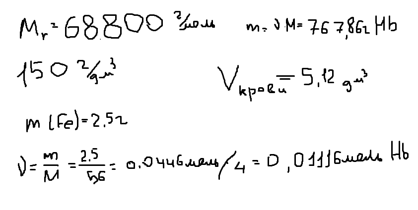 Существует легенда ,в которой говорится ,что один прекрасный юноша подарил своей возлюбленной кольцо,сделанное из железа.Но железо было не простое ,юноша выделил его из собственной кожи . Рассчитайте какой объем крови нужно для получения железа массой 2,50 г. Содержание гемоглобина в крови 150 г/л.M в крови человека 68800г/моль.В состав одной молекулы гемоглобина входит 4 атома железа.