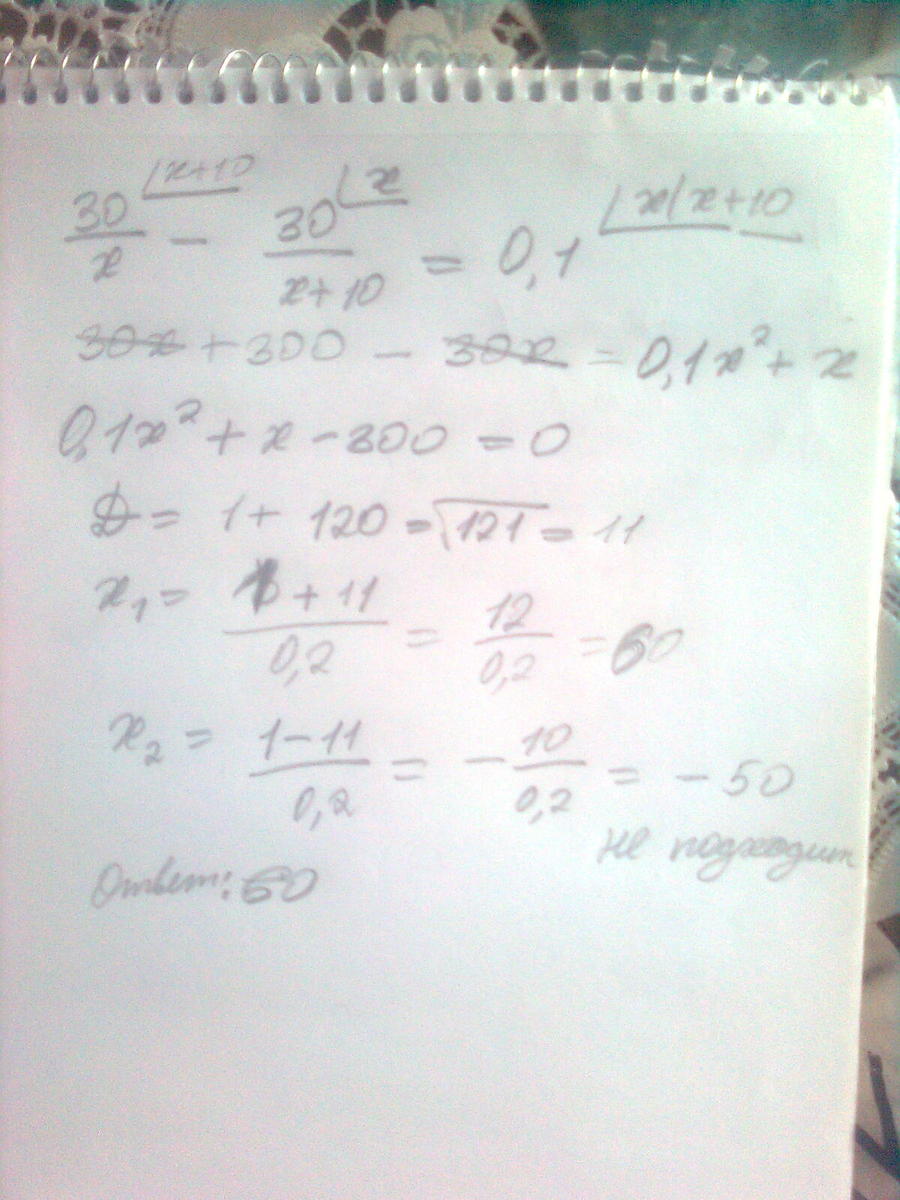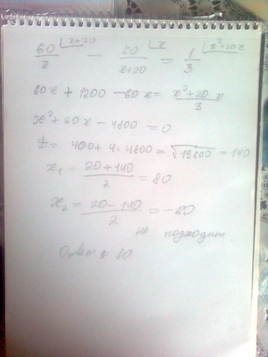 а) Товарный поезд был задержан в пути на 6 мин. Чтобы прибыть в конечный пункт по расписанию, он на перегоне в 30 км увеличил скорость на 10 км/ч. Какова скорость товарного поезда по расписанию? б) Ис поселка в город, расстояние между которыми 60 км, выехал мотоциклист, а через 20 мин вслед за ним выехал легковой автомобиль, который прибыл в город на 10 мин раньше мотоциклиста. Найдите скорость легкового автомобиля, если известно что она на 20 км/ ч больше скорости мотоциклиста.