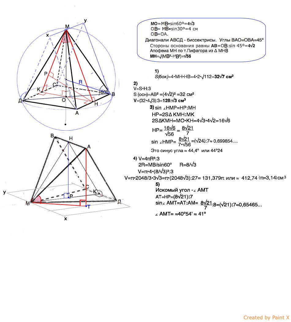 В правильной четырехугольной пирамиде МАВСД боковое ребро равно 8 см и наклонено к плоскости основания под углом 60 градусов . Найти: 1) S боковой поверхности 2) V пирамиды 3) угол между противоположными боковыми гранями 4) V описанного около пирамиды шара 5) угол между боковым ребром АМ и плоскостью ДМС