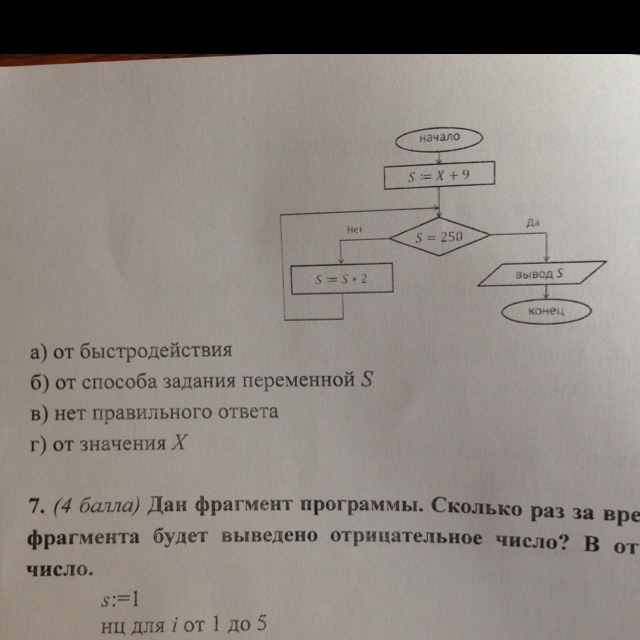 Дан фрагмент алгоритма, представленного в виде блок-схемы. От чего будет зависеть значение S?