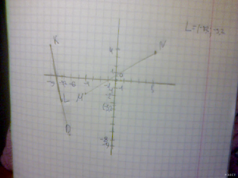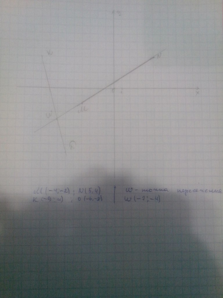 На координатной плоскости проведите прямую MN через точки М(– 4; – 2) и N(5; 4) и отрезок KD, соединяющий точки К(– 9; 4) и D(– 6; – 8). Найдите координаты точки пересечения отрезка KD и прямой MN.