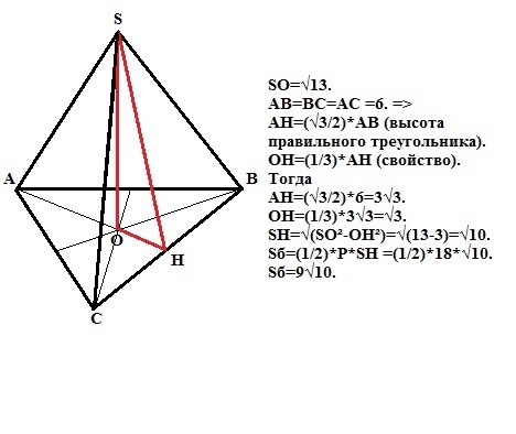Сторона основания правильной треугольной пирамиды равна 6 см, а высота корень из 13 см. Найти площадь боковой поверхности пирамиды. С рисунком