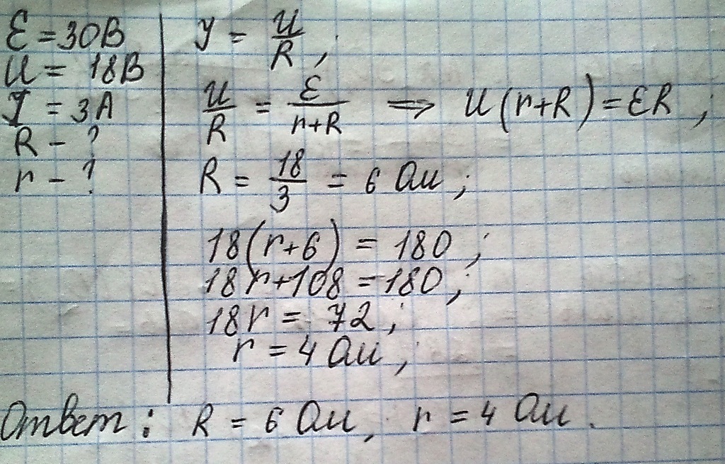Источником тока в цепи служит батарея с ЭДС 30В. Напряжение на зажимах батареи 18 В, а сила тока в цепи 3 А. Определите внешнее и внутреннее сопротивление